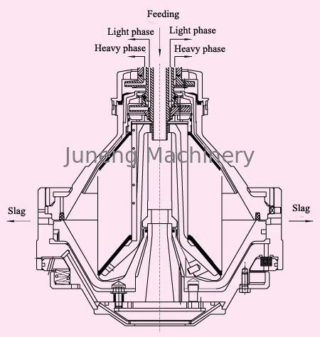 بثثت ال materials unfiltered (سائل مختلط) إلى القلب جزء من هذا آلة (الداخل من الطبل). تحت العمل من قوة قوّيّ خاصّ بالطّرد المركزيّ, سيمرّ ال materials مع ذلك الفاصل من مجموعة من أسطوانة قطعة حزمة. وبعد ذلك, سيتحرّك الفتحة بئر محايد من الأسطوانة قطعة يكون القارن, السائل مع كثافة higher (طور ثقيل) ظاهريّا الفتحة بئر محايد على طول الأسطوانة قطعة, يتدفّق إلى المضخة كبير جابذ. سيكدّس البقية ثقيل كنت في الراسب منطقة, ينتظر لعمليّة تفريغ من آلة. سيتحرّك السائل مع كثافة lower (طور خفيف) إلى الدّاخل ونحو الأعلى على طول الأسطوانة قطعة جدار وسيجمع في المضخة صغير جابذ. outputted الطور ثقيل وضوء طور بالمضخة كبير جابذ ومضخة صغير جابذ على التّوالي.