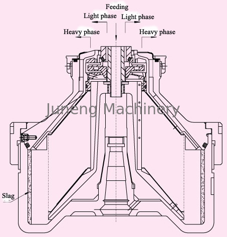 بثثت ال materials unfiltered (سائل مختلط) إلى القلب جزء من هذا آلة (الداخل من الطبل). تحت العمل من قوة قوّيّ خاصّ بالطّرد المركزيّ, سيمرّ ال materials من خلال الفاصل من مجموعة من أسطوانة قطعة حزمة. وبعد ذلك, سيتحرّك الفتحة بئر محايد من الأسطوانة قطعة يكون القارن, السائل مع كثافة higher (طور ثقيل) ظاهريّا الفتحة بئر محايد على طول الأسطوانة قطعة, من خلال القناة حلقيّ من طبل دائرة خارجيّ, يتدفّق إلى الثقيل طور مأخذ. سيكدّس البقية ثقيل كنت في الراسب منطقة, ينتظر لعمليّة تفريغ عندما الآلة عطّلت. سيتحرّك السائل مع كثافة lower (طور خفيف) نحو الأعلى على طول الأسطوانة قطعة جدار وسيجمع في المضخة صغير جابذ, outputted بالمضخة صغير جابذ.